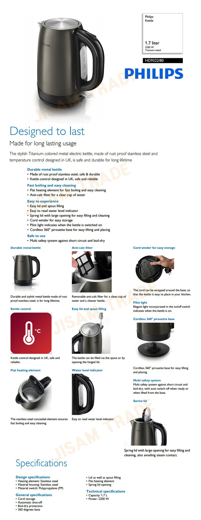 Easy to ecperience- Easy lid and spout filling,Easy to read water lever indicator,Spring lid with large opening for easy filling and cleaning,Cord winder for easy storage,Pilot light indicates when the kettle is switched on , and Cordless 360°pirouette base for easy lifting and placking.