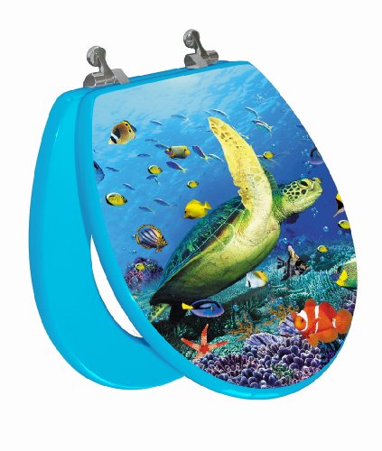 TOPSEAT 3D Ocean Series Round Toilet Seat w/ Chromed Metal Hinges, Wood, Sea Turtle
