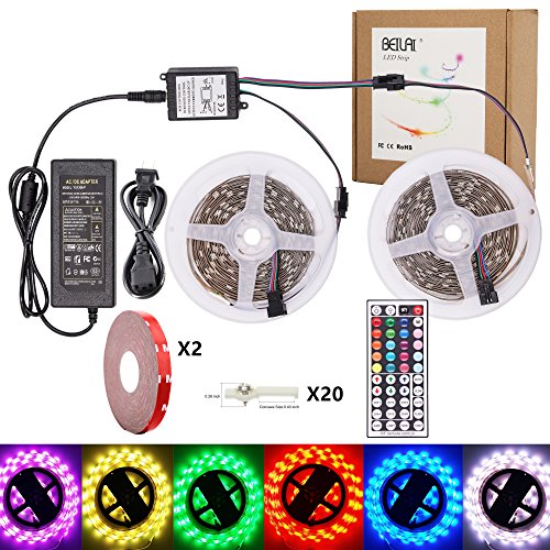 RGB LED Strip Lights Kit,BEILAI LED Light Strip white PCB 5050 DC 12V Flexible Neon Tape 32.8 Ft (10M) 30led/m with 44key RF Controller for Christmas Kicthen Party Indoor and Outdoor decoration
