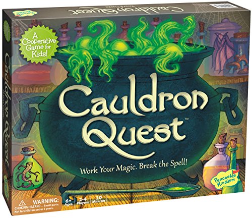 -. Feature : Cauldron Quest is the magical game of potions and spells! / Players work together to find hidden ingredients to create a spell-breaking potion; if they are successful everyone wins! / Children learn strategy, evens and odds, deduction, communication and cooperation / Includes 1 game board, 6 potion bottles, 6 cauldron ingredients, 6 path blockers, 1 spell breaker token, 1 wizard hat with stand, 2 white action dice, 3 black magic dice and instructions for game play / For 2 to 4 players ages 6 years and older; Peaceable Kingdom packaging is all designed to be frustration free - naturally!