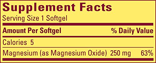 Trust your magnesium supplement needs to Nature Made magnesium 250 mg Softgels. Fifty percent of the US population has an inadequate dietary intake of magnesium. Magnesium participates in more than 300 reactions in the body and is critical to many bodily functions such as promoting a steady heart rhythm, keeping bones strong and converting carbohydrates, protein, and fat into energy. Nature Made magnesium 250 mg is a perfect dose for those who do not consume 100% of the 400 mg recommended daily allowance of magnesium in their daily diet.Feature