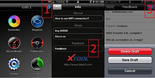 -. Feature : This scan tool work via APP, support IOS & Android Devices. Apple auothorized developer with MFI License(Make For IOS). Communicates with iPhone, iPad and Android devices via Bluetooth 3.0 / Works on most of car with OBD2 protocols located in the USA 1996 & Newer: ISO15765-4(CAN), ISO14230-4(KWP2000), ISO9141-2, J1850VPW, J1850PWM etc..(except hybrid or electric vehicles) / Function: Reads & erases all Diagnostic Trouble Codes. Read data stream, Read freeze frame data, vehicle information Diagnostic, Oxygen testing, Mode 6 testing Also with My dashboard, Performance test, Emissions Testing, History etc.. / The car scan tool transform your cellphone and tablet into a professional-grade car diagnostics tool. Help you find out the trouble issue and clears the Diagnostic Trouble Codes. Pay attention to your driving safety / Save time and money by reading and clearing "check engine" and trouble codes yourself, and determine the problem before consulting a mechanic