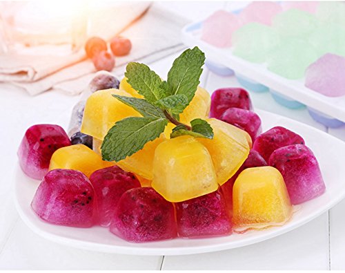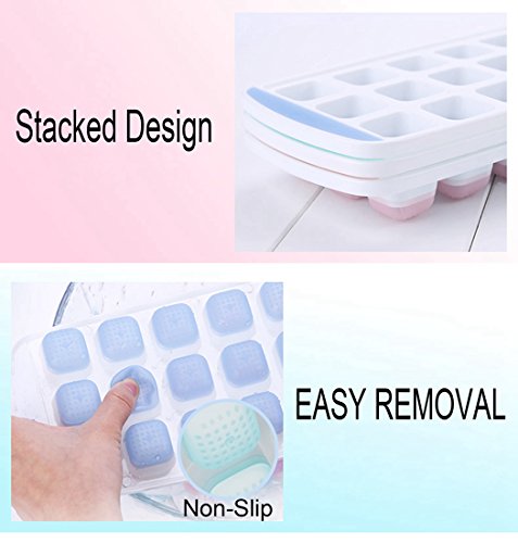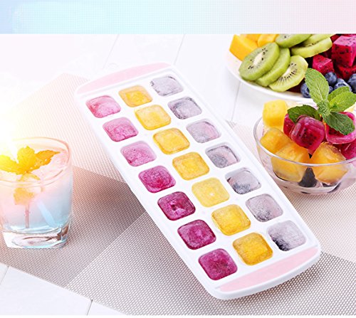 FOOD-GRADE SAFETY MATERIAL: Made of PP (Polypropylene) and TPE (Thermoplastic Elastomer) material , these 3 ice cube trays guarantee safety and durability. Each tray makes 21 nice-sized cubes for a total of 63. Great for home use, parties and bars etc. Pack of 3 : Pink / Blue / Green x 1Pc each color.