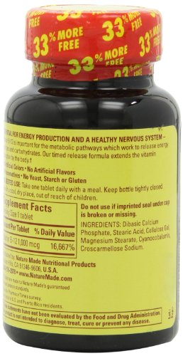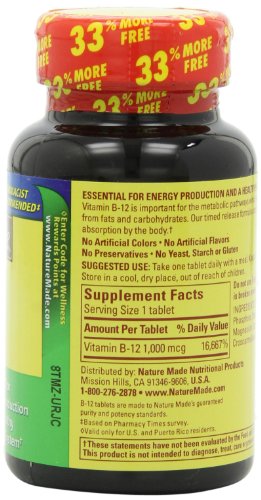 -. Binding : Health and Beauty -. Brand : Nature Made -. Feature : Timed release / No artificial colors / No yeast, starch or gluten / No preservatives -. Label : Nature Made -. Manufacturer : Nature Made -. MPN : 031604027315 -. PartNumber : 031604027315 -. ProductGroup : Health and Beauty -. ProductTypeName : HEALTH_PERSONAL_CARE -. Publisher : Nature Made -. Studio : Nature Made -. Title : Nature Made Vitamin B-12 Timed Release Tablets, Value Size, 1000 Mcg, 160 Count