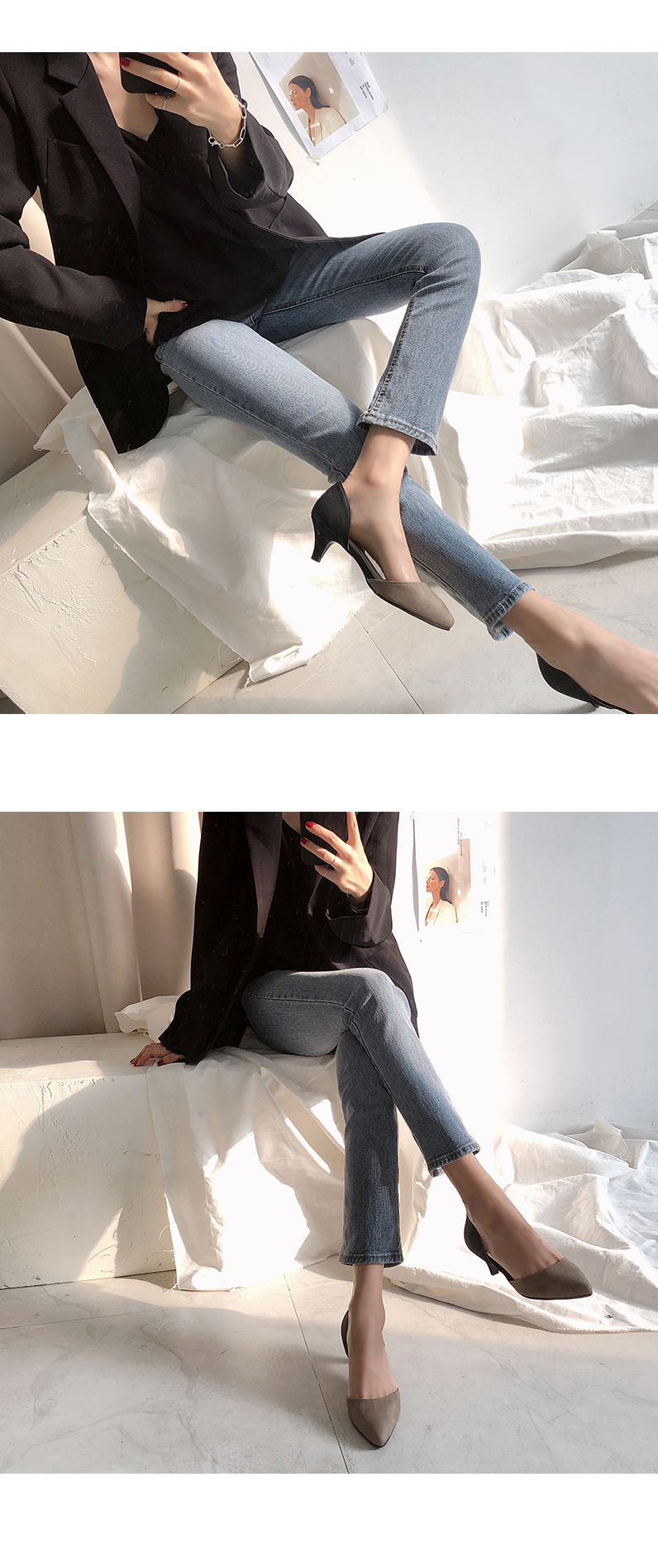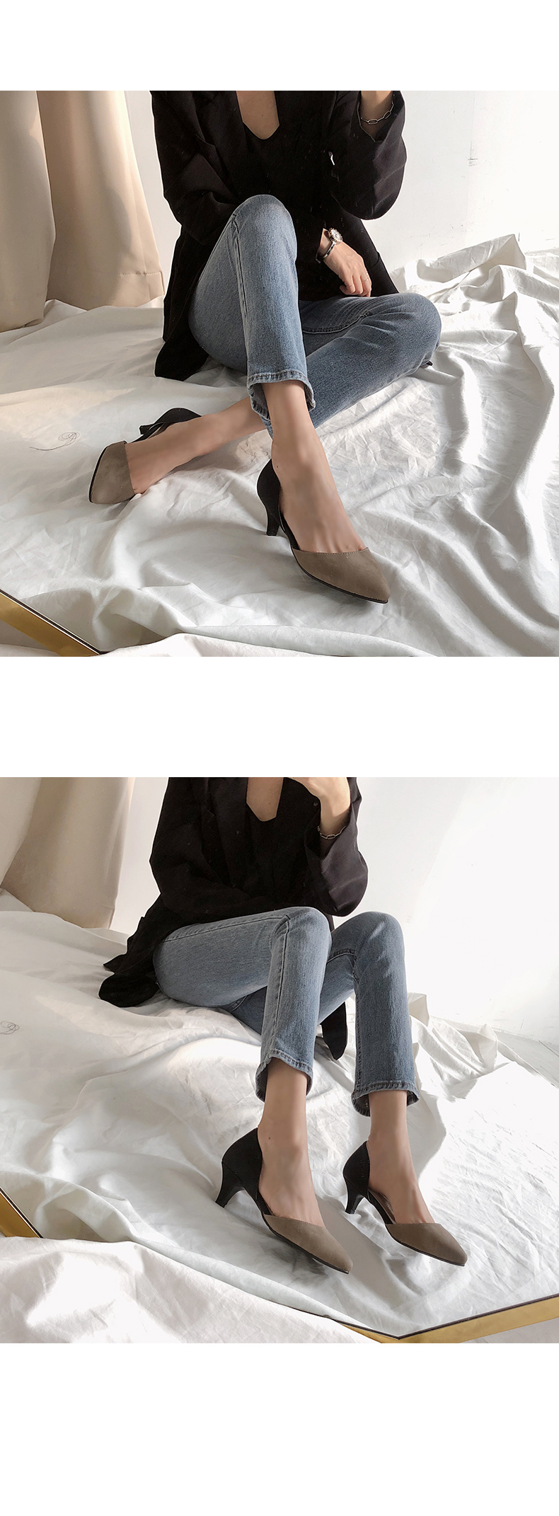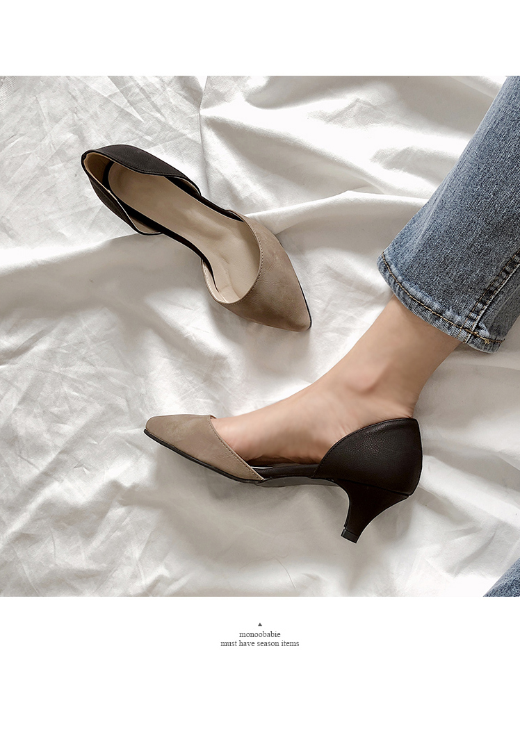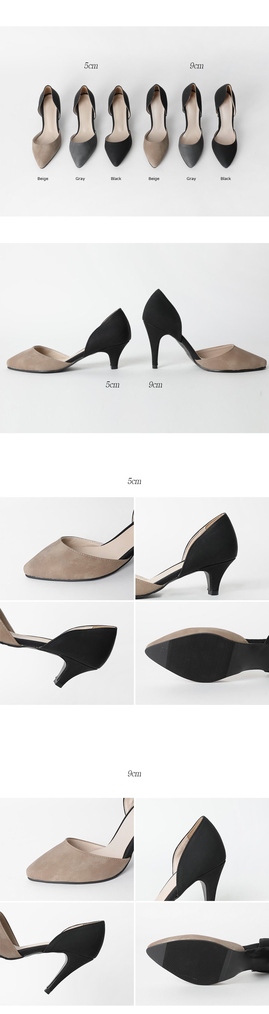 9cm의 적당한 힐라인과 누구나 부담없이 신을 수 있는 5cm의 미들힐로 제작된 스타일이에요