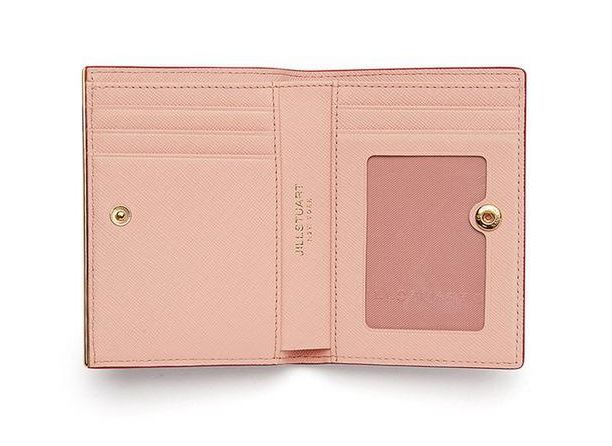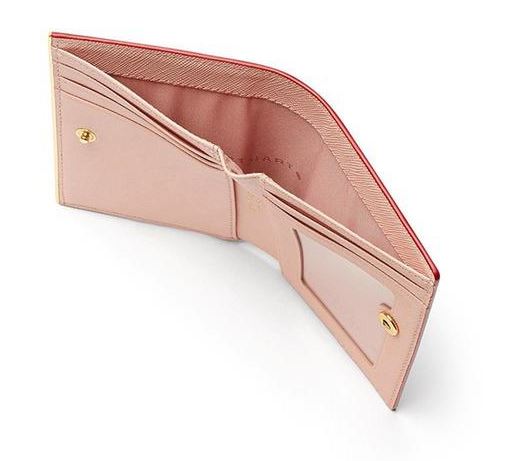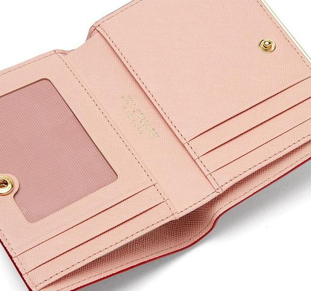 내부 베이비 핑크 배색으로 여성스럽고, 심플한 외관을 보여주며, 하단의 로고와 골드 바 장식으로 포인트를 준 2단 반지갑입니다.