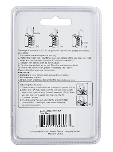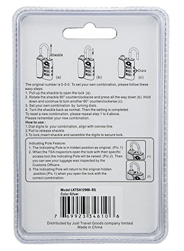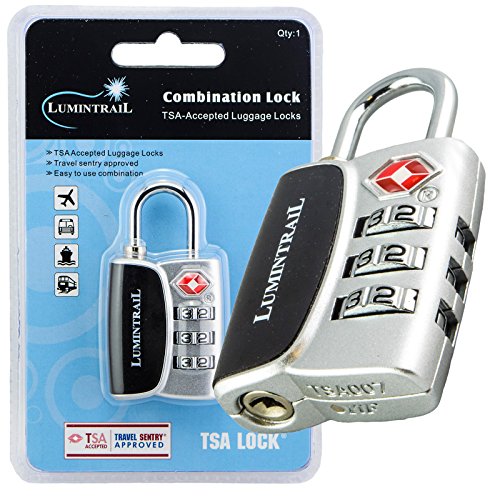 The Lumintrail 3-digit combination travel lock securing bags, zip pulls, suitcases, computer bags, and much more! The LKTSA12068 comes in three colors--black, red, and silver--for easy baggage identification. And with set-your-own combination convenience, you don't have to worry about losing the key while you travel. TSA approved! No need to have unlocked baggage while traveling anymore. The red-and-white Travel Sentry mark on the lock notifies screeners that they can unlock and relock your baggage without having to break the lock open. The Red Indicator feature pops up when lock is opened by TSA agents, so you know when your luggage has been checked. Indicator resets when you open the lock with your combination Features: - Suggested uses: luggage, backpacks, bags, small cabinets, briefcases, computer bags, for indoor use only