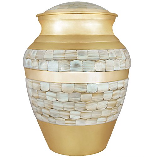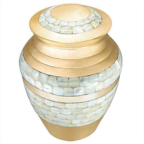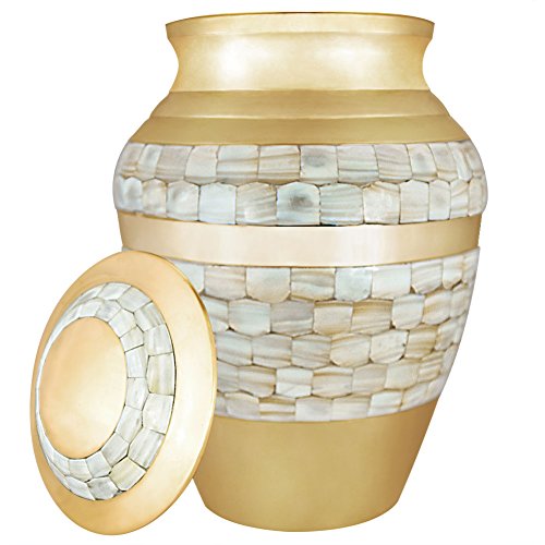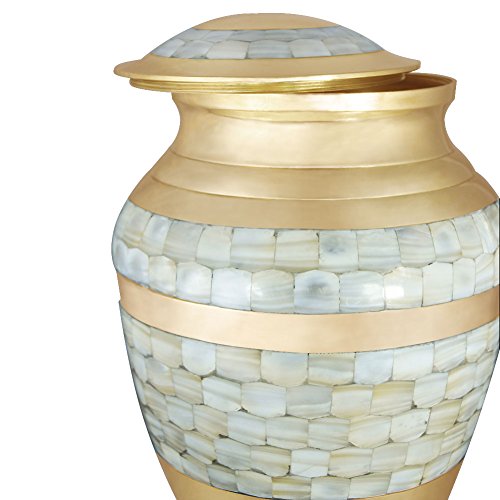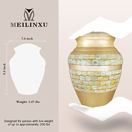 Funeral Urn by Meilinxu - Cremation Urn for Human Ashes Adult and Memorial Urn - Hand Made in Brass - Hand Engraved - Display Burial Urn At Home or in Niche at Columbarium (Mother of Pearl Urn, Large