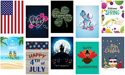 - CELEBRATE ALL YEAR ROUND - Includes 10 Double-Sided garden flags: Happy Valentine’s day, St. Patrick day, Happy Easter, Welcome Spring, It’s Summer Time, Happy 4th of July, Happy Halloween, Thanks Giving, Merry Christmas and American Flag(garden flag size)
