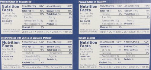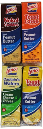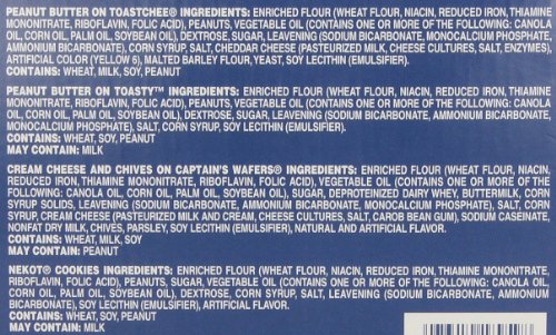 -. Feature : 8 Packs of Nekot Cookies / 8 Packs of Cream Cheese with Chives on Captain's Wafers / 8 Packs of Peanut Butter on Toasty / 12 Packs of Peanut Butter on Toastchee / Each Box comes with thirty six assorted packs of delicious sandwish crackers / no preservatives and 0 Grams trans fat