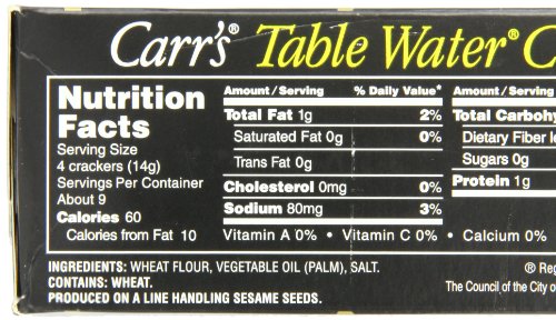 -. Feature : Contains crackers, bite size 4.25 ounces each in a pack of 12 / Thin, crispy crackers, baked golden brown / Produced with line handling sesame seeds and wheat / Kosher certified / Pack of six, 4.25-ounce boxes of Carr's Table Water Crackers / Classic crackers are a party platter staple / Contains wheat; produced in a line handling sesame seeds; kosher/parve / Pairs perfectly with cheeses, spreads, and sandwich meats