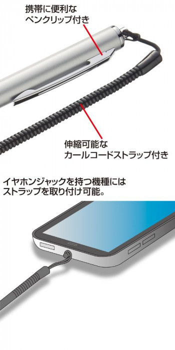 ペン先に柔らかい導電性シリコンゴムを使用しているので、柔らかく、快適な操作が可能です。伸縮可能なカールコードストラップ付きなので持ち運びに便利です。 |