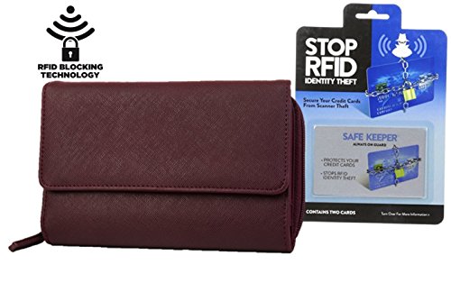 -. Feature : RFID WALLET BLOCKING TECHNOLOGY - With built in RFID protection stop identity theft and electronic pick pocketing with and protect your credit cards and other RFID enabled cards from scanners and readers. / PERFECT FOR TRAVELING AND FEELING SAFE - This wallet is perfect to use when traveling, it will hold your passport and store your checkbook keeping everything secure with a button snap closure. Store all your essentials in one location / KEEP ORGANIZED LOTS OF STORAGE - 8 credit card pockets, 2 ID window's, 4 picture pockets, 3 large horizontal pockets, a dedicated checkbook pocket with pen loop, 3 zipper pockets and 2 accordion pockets / THREE SEPARATE ZIPPER POCKETS - One large top zip around accordion pocket opens to 3 interior compartments with two large pockets and an additional interior zipper pocket. Plus an exterior zipper pocket typically used as a change purse. / 2 RFID BLOCKING SLEEVES - Easy to use, place 1 Safe Keeper RFID Blocking Card in front of your credit cards and 1 behind, creating a barrier on both sides. That's it!