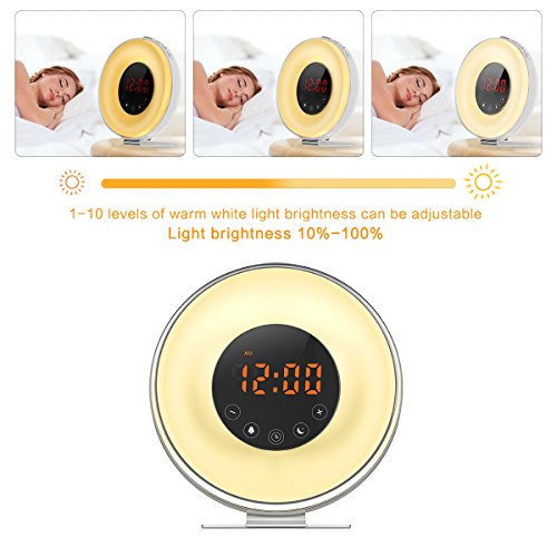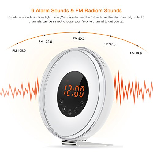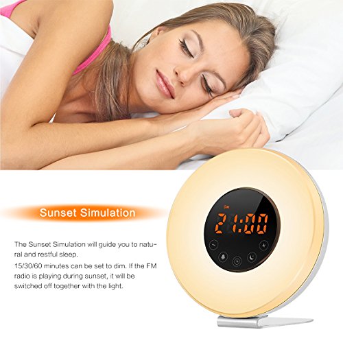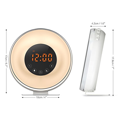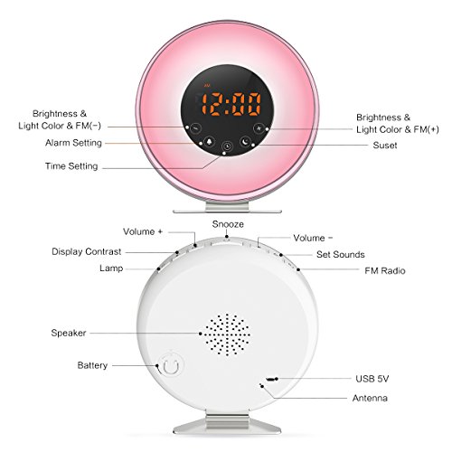 Studio : Konesky Publisher : Konesky Binding : Electronics Product Description The Upgraded Wake UP Lights---Lazy boys and girls,rise rise! Get up get up !! Features: ? Sunrise Simulation Wake-up Function, let you rest assured that sleep, sunrise simulation wake up light wakes your gradually.(It is advisable to place the wake-up lamp at 40-50cm from the head) ? Sunset night sleep mode, simulated sunset let you relax physically and easily relaxed and sleep, increase the sunset mode can be set time (15/30/60 minutes countdown) ? FM radio function, can be set to alarm clock ringtones, so you wake up every day to listen to your favorite radio station, to understand the latest daily information. ? The clock alarm and snooze function, if you want to sleep, after the alarm, click snooze, 5 minutes to continue to sound 2 minutes. ? 12/24 hours mode conversion, the use of more convenient, more simple operation; LED clock display brightness switch (low - highlight - turn off the LED clock display)