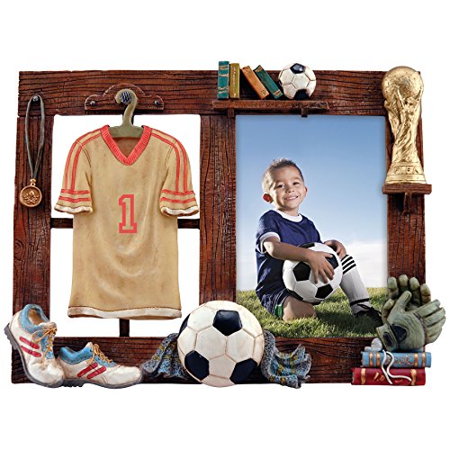 - The soccer frame features a cream and red soccer jersey, soccer cleats, a soccer ball, a gold trophy and more