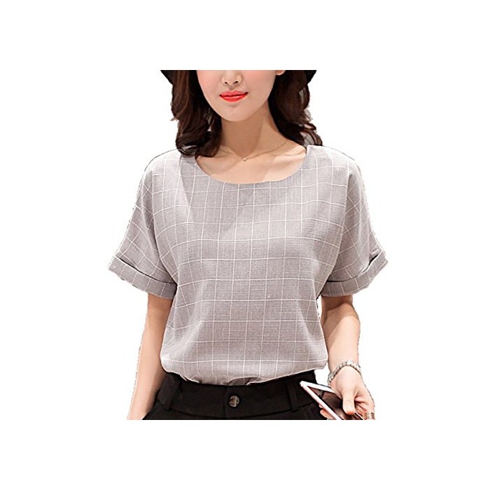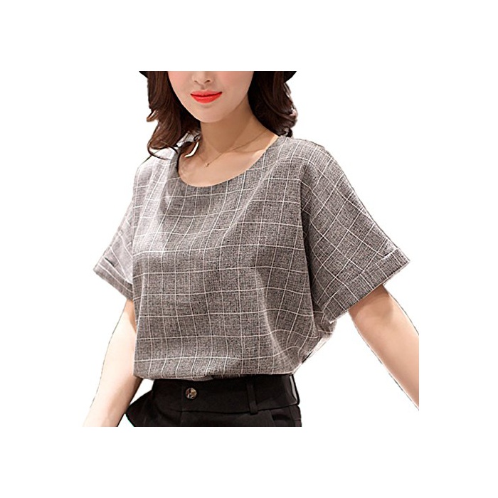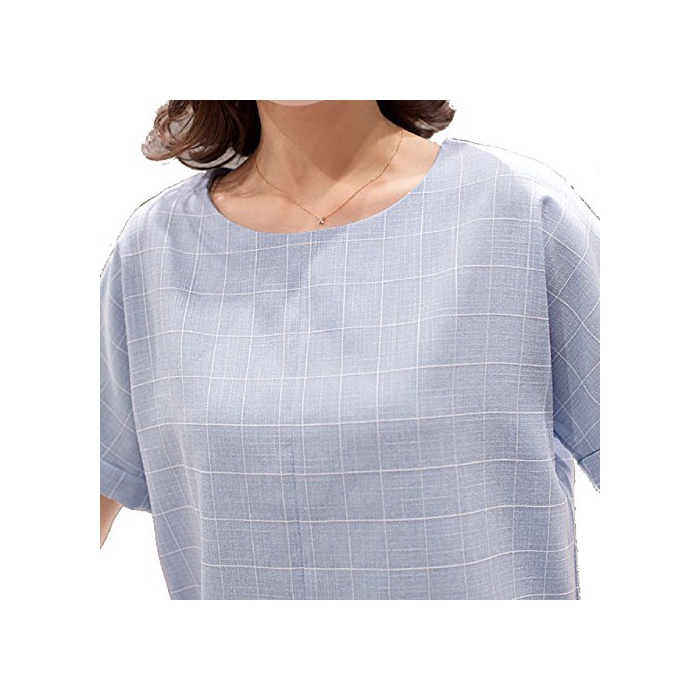 코튼 소재의 체크 무늬 반소매 라운드 넥 블라우스입니다.