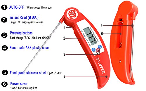 - INSTAND READ THERMOMETER:within 6-8 seconds response time,°F/°C button,auto-off and HOLD feature