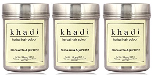 -. Binding : Misc. -. Brand : KHADI -. EAN : 8906051307346 -. Feature : Herbal Ayurvedic Hair Coloring Treatment - Dark Red - Made with Henna & Jatropha / Henna & Jatropha - Fortifying & Coloring for the hair - Naturally impart a dark red color - cooling and soothing to the scalp - stimulate blood flow and encourages hair growth / Amla - Detoxifying & Fortifying - High levels of Vitamin C - Eliminate Germs and Scavenge Free Radicals - Naturally Anti-microbial & Anti-oxidant` / Henna is India's oldest and most celebrated hair coloring herb - it not only gives the hair rich and natural color but strengthens it and encourages its growth / Herbal Formulation is safe and effective for all hair & skin types -. Label : khadi -. Manufacturer : khadi -. PackageQuantity : 1 -. ProductGroup : Beauty -. ProductTypeName : BEAUTY -. Publisher : khadi -. Studio : khadi -. Title : KHADI - Herbal Hair Colour Henna Amla & Jatropha - 150g (Pack of 3)