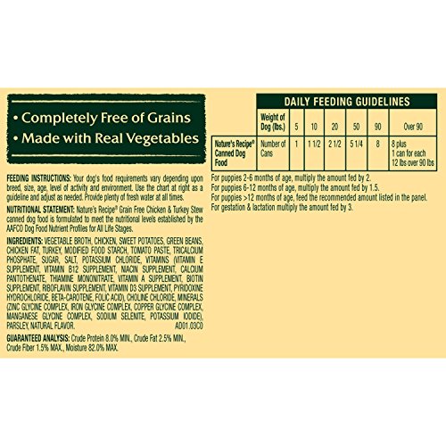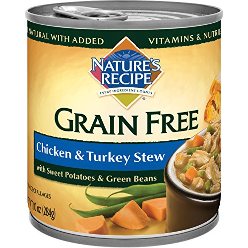 Nature's Recipe Grain Free Chicken & Turkey Stew is healthy dog food made with premium ingredients including real chicken & turkey. High-quality protein from these sources helps support lean muscles, and it's easy on your dog's stomach. Highly digestible sweet potatoes and green beans are grain-free sources of carbohydrates, and all the goodness is served in a hearty gravy. With a taste that dogs love plus the nutrition they need, this healthy grain-free dog food will help your best friend thrive!