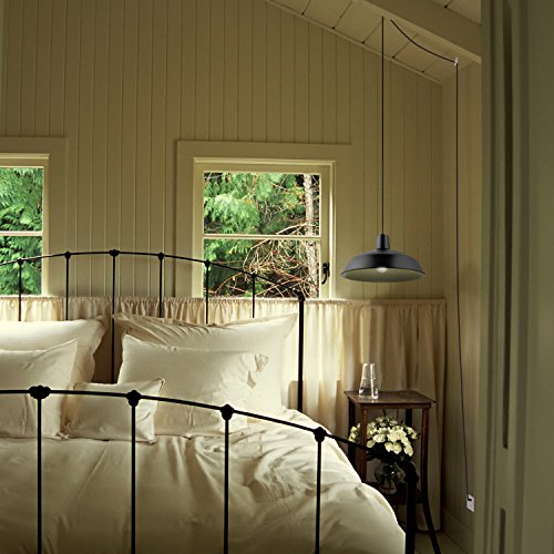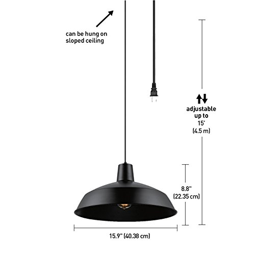 With its matte black finish and modern profile, the Globe Electric's Barnyard 1-Light 16" Industrial Warehouse Plug-In Pendant emits a cool, practical presence, like those found in large warehouses, artists' lofts, or retro-style barber shops. Made of durable metal, the transitional-style shade offers a clean, casual look and general all-over room lighting. Use it anywhere from over the kitchen table or bar to above a sitting area in the living room or in a workshop, game room, or studio. The light comes with a 15-foot power cord for easy hanging installation. Requires one 100W medium based Edison bulb (sold separately). Check out Globe Electric's vintage inspired bulbs to add a classy unique touch.