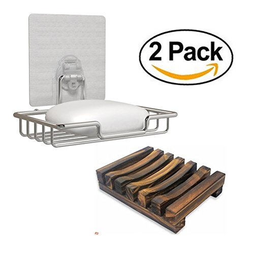 TianJi Sponges Holder Soap Dish 2pcs Set Wooden Soap Case and Self Adhesive 304 Stainless Steel Easy Drain Soap Holder for Bathroom and Shower