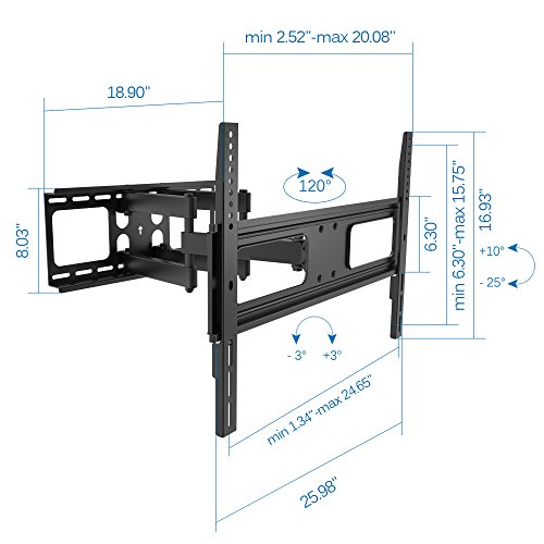 -. Feature : The super economy full-motion mount accommodates most 37"-80" LED, LCD flat panel TVs, Max Load up to 110lbs.VESA:200x200,400x200,300x300,400x400,600x400. / Swiveling arm offer maximum viewing flexibility, -60°~+60°swivel; Freely tilting allows easy TV angle adjustment,-20°~ +10°tilt; Built-in level adjustment ensures perfect positioning, +3°~-3°level Adjustment. / This mount extends out 18.3inches from wall and allows full-motion capabilities. / Cable clips keep cables concealed and organized. Free 6ft HDMI Cable Included. / Simple construction ensures a quick and easy installation.100% Lifetime Guarantee. 10 years warranty.