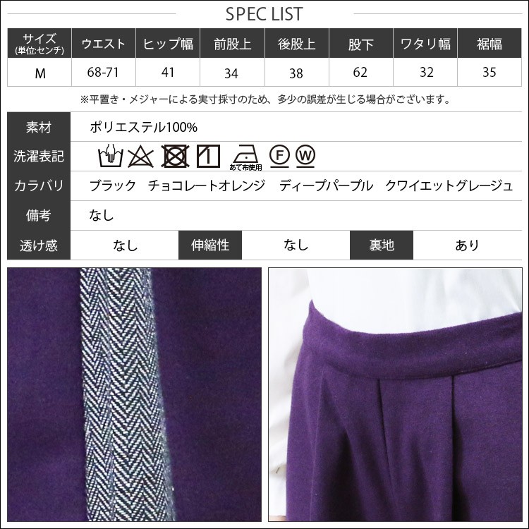 M:ウエスト幅 68-71cm ヒップ幅 41cm 前股上 34cm 後股上 38cm 股下 62cm ワタリ幅 32cm 裾幅 35cm