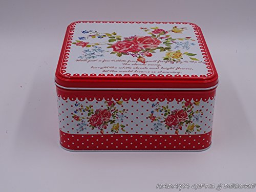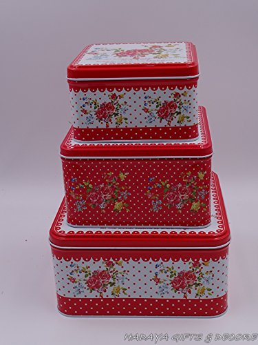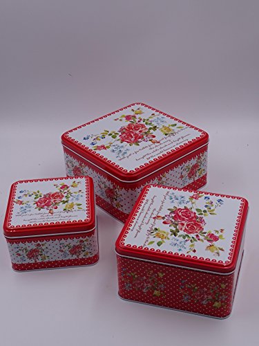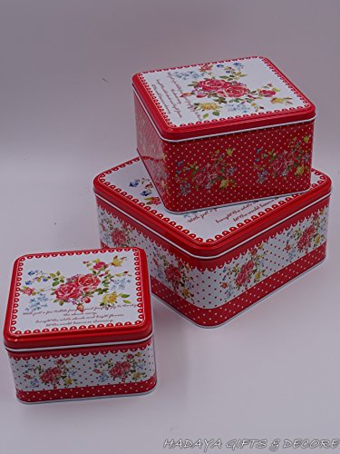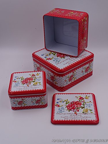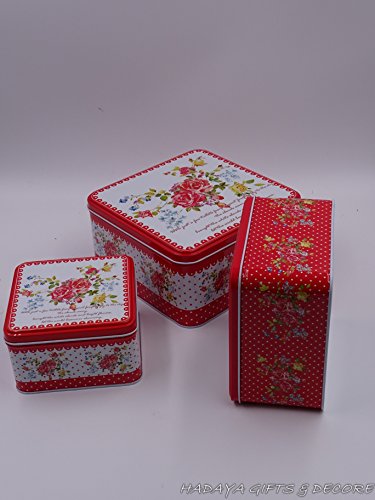 Elegant French Style set of 3 Square multipurpose Red storage tins, shabby chic, with beautiful floral design
