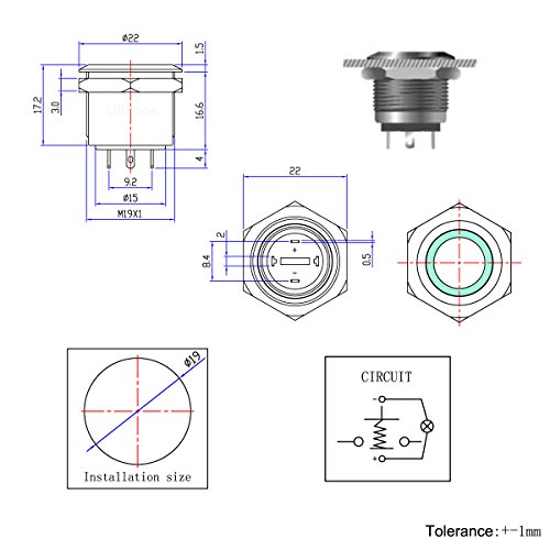 Ulincos Momentary Pushbutton Switch U19D1 1NO SPST Black Metal Shell with Green LED Ring Suitable for 19mm 3/4" Mounting Hole Pack with a Resistor (Green)