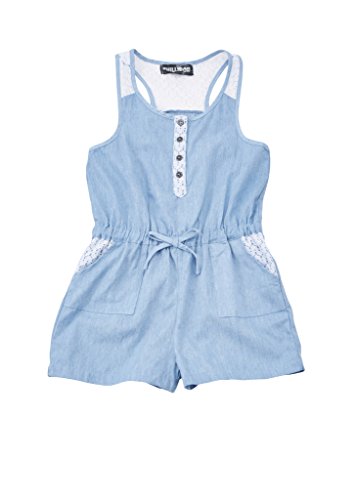 -. Feature : FEMININE & FUN: This denim and lace romper is a must-have for your girl's summer wardrobe, providing a charming look for your cutie. / DELIGHTFUL DETAILS: With lace and button details, and a drawstring waist, this romper is sure to receive many compliments. / COOL & COMFY: Light denim fabric and tank style top will keep your girl comfortable, and help her beat the summer heat while looking fabulous. / PREMIUM QUALITY: Made of durable denim and will withstand many wears and washes without losing its color or shape. / EASY CARE: Machine washable and dryer friendly on a low heat setting.