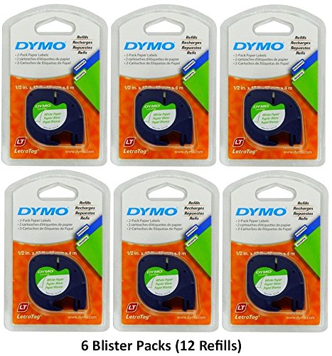 -. Binding : Office Product -. Brand : Dymo -. Color : White -. EAN : 0791836882020 -. Feature : Dymo 10697 Self-Adhesive White Paper Labeling Tape for LetraTag (LT) Label Makers; 6 Blister Packs (12 Refills) / Each Blister Pack with Hang Hole contains Two 1/2" Wide x 13ft Long (12mm x 4m) Refill Rolls / Black Print on White paper tape; Economical labels for indoor use are made of Matte White paper and easy to peel and Cut; Economical solution for labeling almost anything anywhere in your home / Blister pack measures 6.14H x 3.98W x 1.54D in, Weights 1.5 ounces / Made in Belgium; UPC 071701106971 -. IsAutographed : 0 -. IsMemorabilia : 0 -. Label : Dymo -. Manufacturer : Dymo -. Model : 10697 -. MPN : 10697 -. NumberOfItems : 6 -. PackageQuantity : 1 -. PartNumber : 10697 -. ProductGroup : Office Product -. ProductTypeName : OFFICE_PRODUCTS -. Publisher : Dymo -. Studio : Dymo -. Title : Dymo 10697 Self-Adhesive White Paper Labeling Tape for LetraTag (LT) Label Makers; 6 Blister Packs (12 Refills); Each Blister Pack contains Two 1/2" Wide x 13ft Long (12mm x 4m) Refill Rolls -. UPC : 791836882020