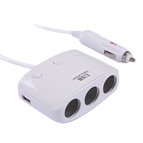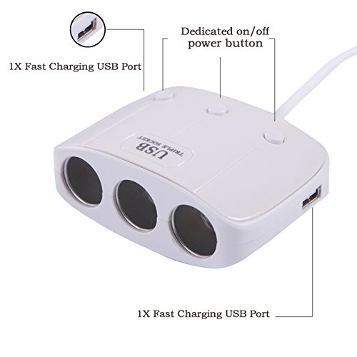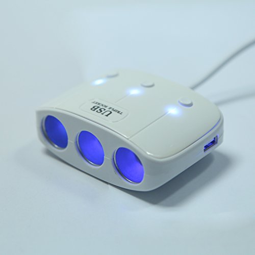 HDE Glossy 3 Socket Cigarette Lighter Charger DC Adapter with Dual USB [2.0A] (White)