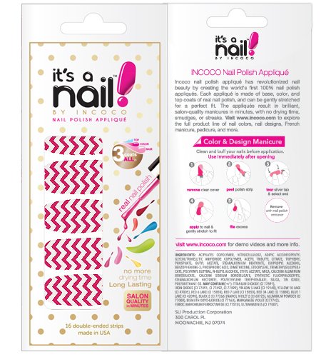 THE PERFECT MANICURE IN MINUTES! Incoco has revolutionized nail beauty by creating the world's first 100% real nail polish appliques! Each applique is made of a base, color and top coat of real nail polish. These appliques are flexible and can be gently stretched to easily fit any nail size and shape. The result is a brilliant, salon-quality manicure in minutes with no dry time, smudges or streaks.