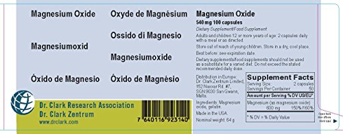 -. Feature : Magnesium oxide powder / 540 mg per capsule / Serving size: 2 capsules / 100 capsules per bottle, 50 servings / Manufactured under Dr. Hulda Clark's strict protocols