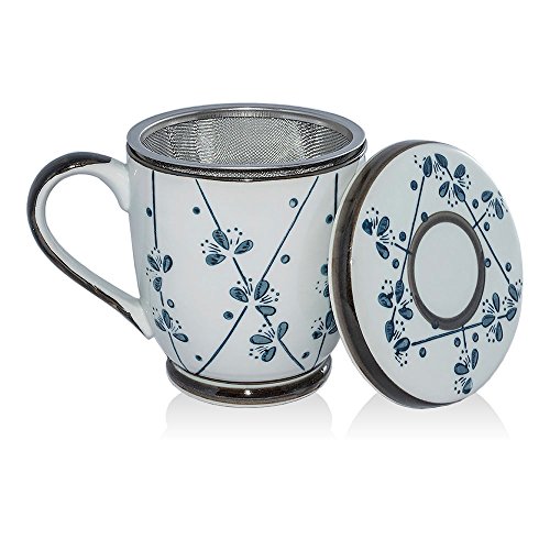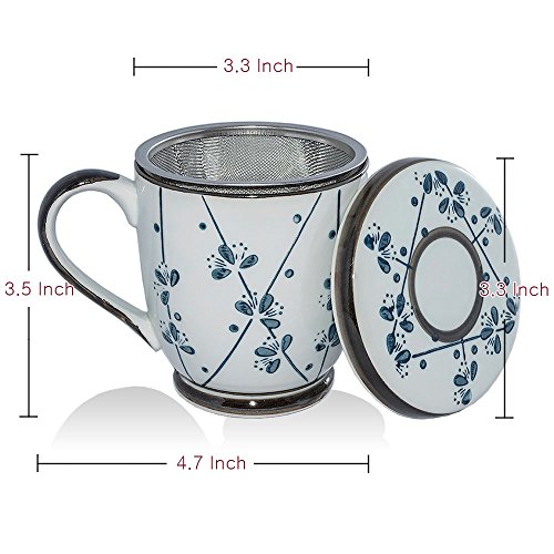 -. Feature : Mug Holds 12oz / Brew tea easily - Tea mug with infuser & lid helps to brew tea in a simple and quick way. / Usebillity - The handle design makes them easy to hold when you enjoy the hot tea, coffee and more. / Neat Design - Japanese Zen Style Mug of calm and elegant pattern. / Healthy & Easy to care - KFDA approved, Porcelain ware is stain free, easy to clean. All parts are dishwasher safe, Mug and Lid is microwavable.