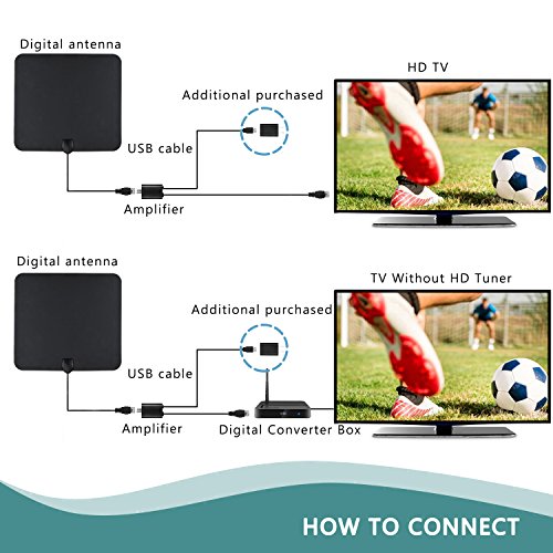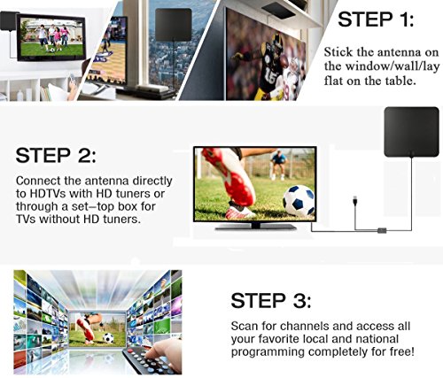 AatalTV 50 Miles Indoor Amplified TV Antenna Fast and easy set up in 3 steps: a.Connect the antenna to"CABLE/ANT IN"on the back of any HDTV b.Place the antenna in an optimal position, usually on a wall or window(strongly recommend) c.Scan TV channels and be ready to enjoy free HD TV! Two really useful websites to find out what channels you should be able to get at your home 1. Antennaweb.org is run by the Consumer Electronics Association and the National Association of Broadcasters.The interface hasn't changed in over a decade, but it's simple and the information is useful. 2. TVFool.com is more complex, but gives a lot more detail including gorgeous plots of theoretical signal strength and where the broadcast towers are located. Tips: And if you're looking for a cable-style TV schedule, TitanTV.com is a free Web service that lists local programming. Specifications: Model Number:CCBMT350 Frequency Range: VHF 47-240Mhz, UHF 470-862Mhz Receiving Range: FM/VHF/UHF Gain: 30dB with Amplifier Maximum Output Level: 100dBμV Polarization:Linear Impedance: 75Ω Noise Figure: ≤3dB Package: 1* AatalTV 50Miles TV Antenna with 10ft Coax Cable 1* TV Channels Amplifier Booster with spare cable. 1* User Manual. 4* EVA Stickers. 0 |