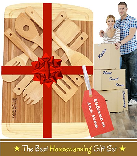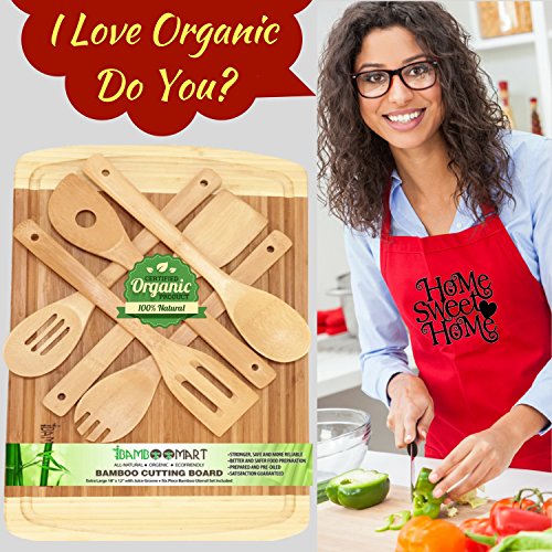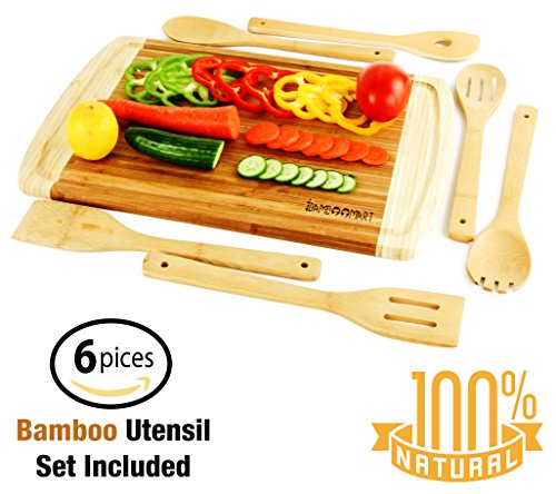 - ALL-NATURAL, ECO-FRIENDLY : Each of our wooden organic cutting boards and cooking & serving wooden utensils are crafted with food safe, organic bamboo. This makes them better for every food prep need from slicing meat, fish, turkey to chopping veggies, fruit, onions, serve up appetizers or making bread. It also works great as Bamboo Cheese Board or woden Serving Tray.