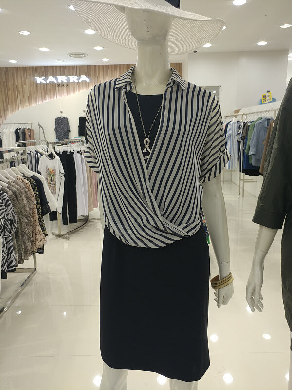 세련된 스트라이프 쉬폰 블라우스와 민소매 스판원피스 Set 는