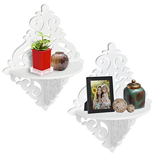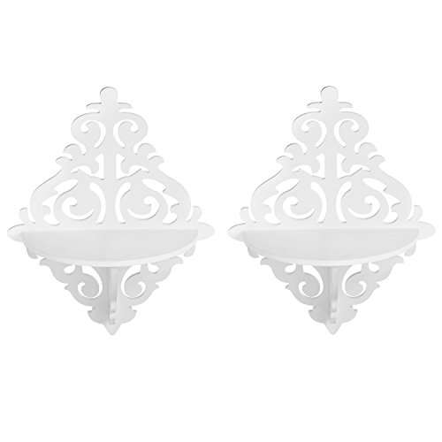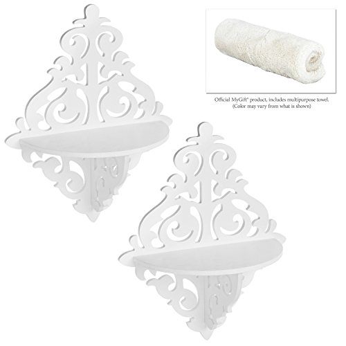 - Feature : Each wooden wall shelf in this set of 2 features a white finish and an elegant scrollwork design. / The rounded shelf is ideal for displaying a variety of knickknacks, keepsakes, and small home decor items. / Easy to assemble and mount on the wall in your hallway, living room, kitchen or bathroom. / **Official MyGift® product includes multipurpose cleaning towel.** Other items shown not included. / Approximate Dimensions (each shelf): 12 in. W X 15 in. H X 5.25 in. D.