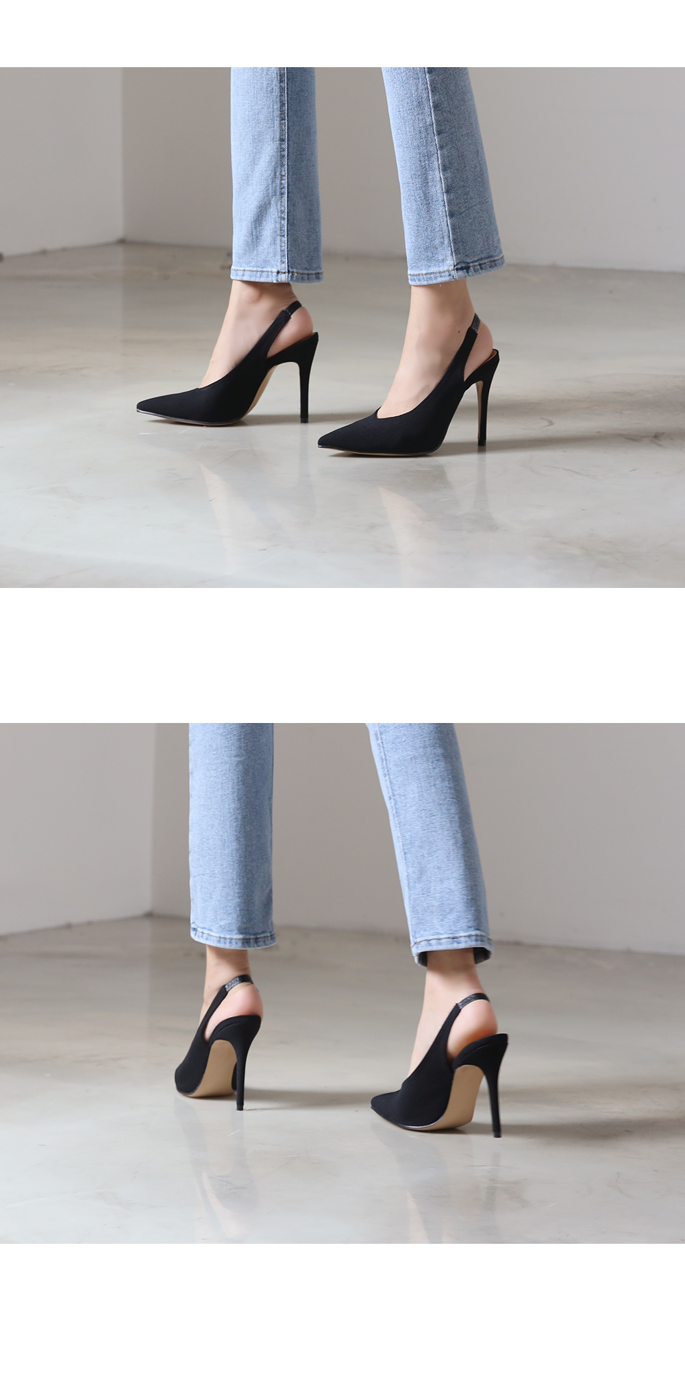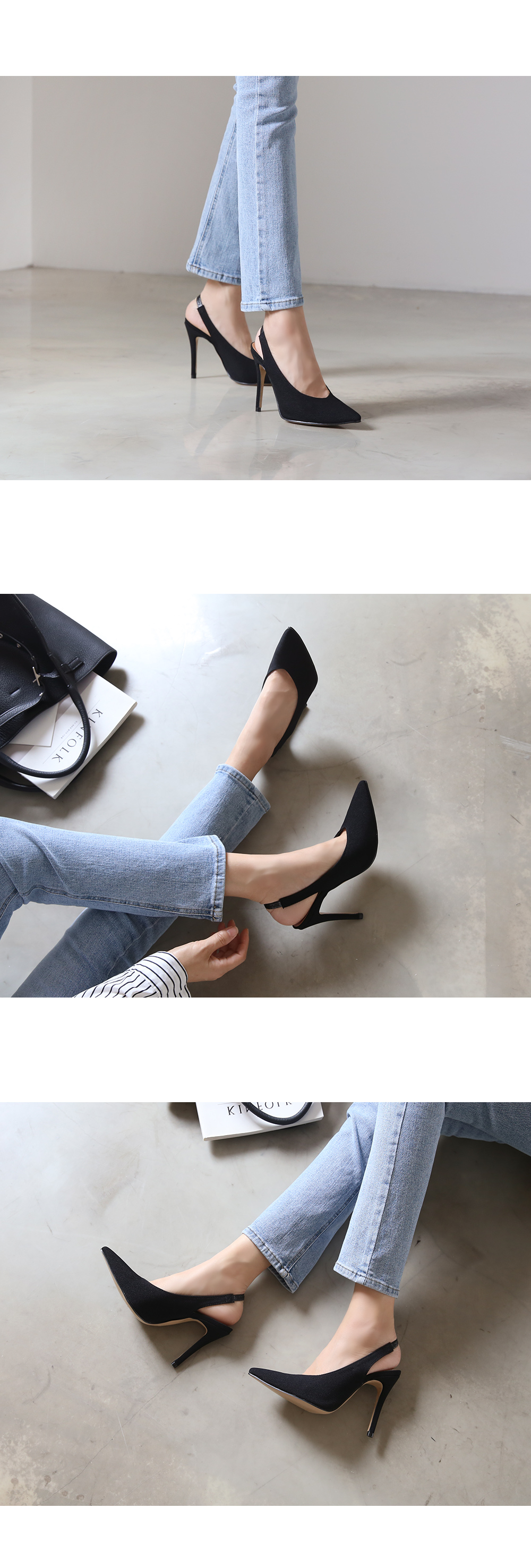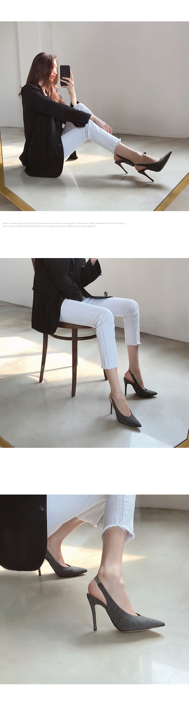 10cm의 킬힐 높이지만 불편하지 않은 착화로 데일리로 즐겨봐도 무리가 없으며 코튼소재로 제작되다보니 캐쥬얼한 스타일링에 잘 녹아듭니다.