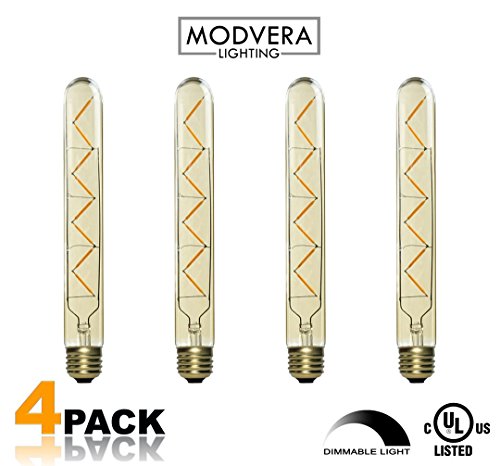 4 pack - Modvera LED Filament Tube Bulb T30 Tubular Bulb Edison Antique Style 5 Watt with 40 watt Equivalent 2200K Glass E26 Base Dimmable T9 Tube (8.5 inches Long) UL listed and RoHS compliant
