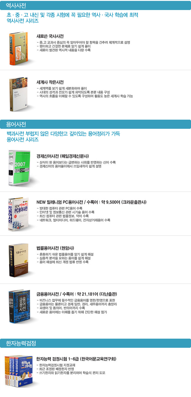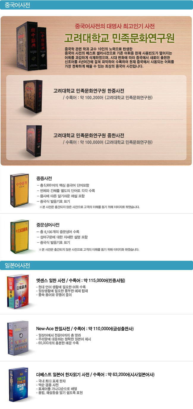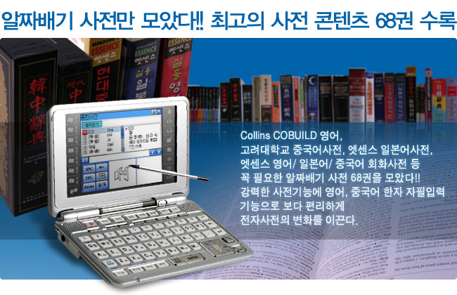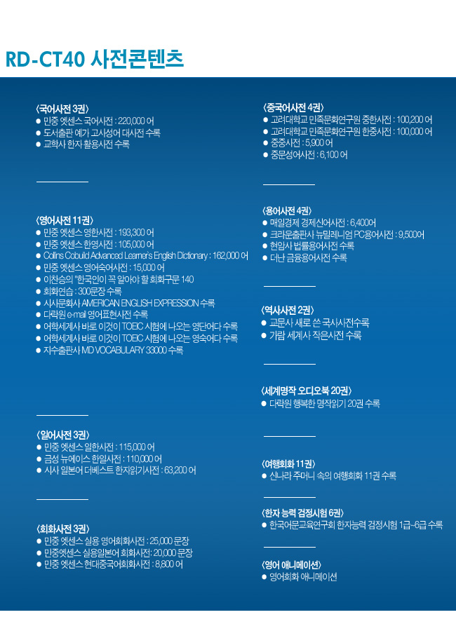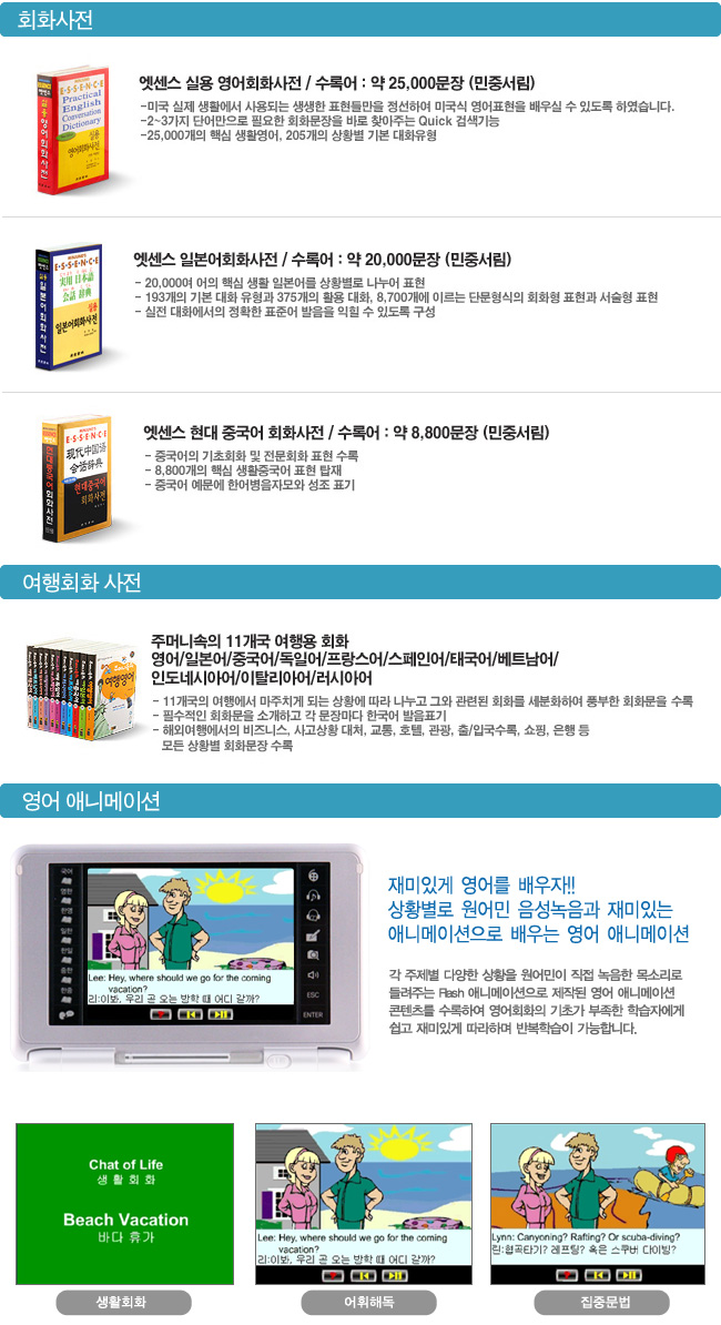 | 사전부 | <국어사전 3권> ● 민중 엣센스 국어사전 : 220,000 어 ● 도서출판 예가 고사성어 대사전 수록 ● 교학사 한자 활용사전 수록 <영어사전 11권> ● 민중 엣센스 영한사전 : 193,300 어 ● 민중 엣센스 한영사전 : 105,000 어 ● Collins Cobuild Advanced Learner`s English Dictionary : 162,000 어 ● 민중 엣센스 영어숙어사전 : 15,000 어 ● 이찬승의 "한국인이 꼭 알아야 할 회화구문 140" ● 회화연습 : 300문장 수록 ● 시사문화사 AMERICAN ENGLISH EXPRESSION 수록 ● 다락원 e-mail 영어표현사전 수록 ● 어학세계사 바로 이것이 TOEIC 시험에 나오는 영단어다 수록 ● 어학세계사 바로 이것이 TOEIC 시험에 나오는 영숙어다 수록 ● 지수출판사 MD VOCABULARY 33000 수록 <일어사전 3권> ● 민중 엣센스 일한사전 : 115,000 어 ● 금성 뉴에이스 한일사전 : 110,000 어 ● 시사 일본어 더베스트 한자읽기사전 : 63,200 어 <회화사전 3권> ● 민중 엣센스 실용 영어회화사전 : 25,000 문장 ● 민중엣센스 실용일본어 회화사전: 20,000 문장 ● 민중 엣센스 현대중국어회화사전 : 8,800 어 <중국어사전 4권> ● 고려대학교 민족문화연구원 중한사전 : 100,200 어 ● 고려대학교 민족문화연구원 한중사전 : 100,000 어 ● 중중사전 : 5,900 어 ● 중문성어사전 : 6,100 어 <용어사전 4권> ● 매일경제 경제신어사전 : 6,400어 ● 크라운출판사 뉴밀레니엄 PC용어사전 : 9,500어 ● 현암사 법률용어사전 수록 ● 더난 금융용어사전 수록 <역사사전 2권> ● 교문사 새로 쓴 국사사전수록 ● 가람 세계사 작은사전 수록 <한자 능력 검정시험 6권> ● 한국어문교육연구회 한자 능력 검정시험 1급~6급 수록 <세계명작 오디오북 20권> ● 다락원 행복한 명작읽기 20권 수록 <여행회화 11권> ● 신나라 주머니 속의 여행회화 11권 수록 <영어 애니메이션> ● 영어회화 애니메이션 수록 |