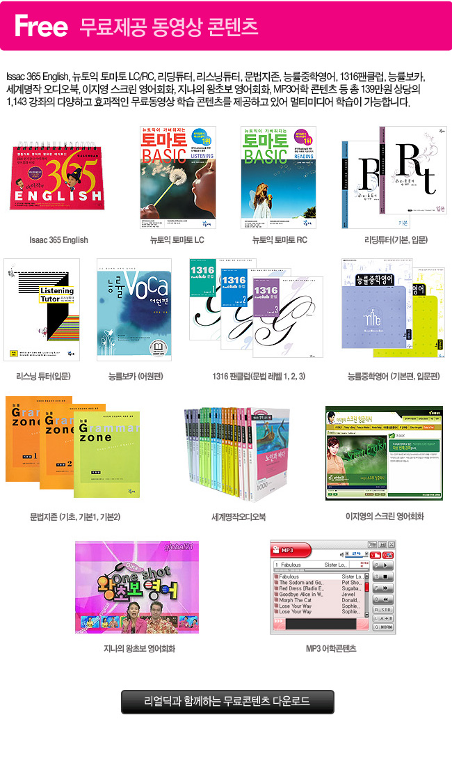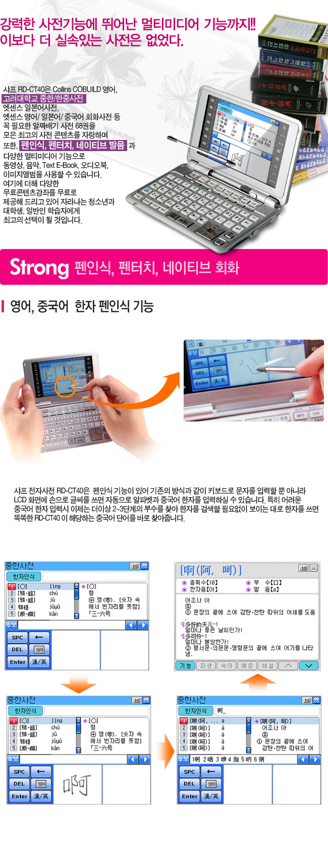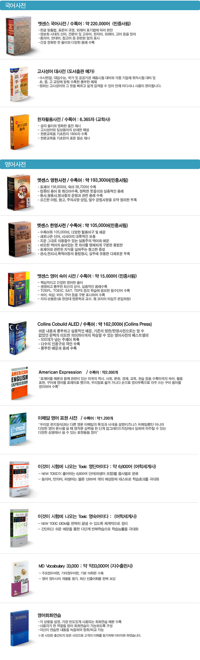 | 사전부 | <국어사전 3권> ● 민중 엣센스 국어사전 : 220,000 어 ● 도서출판 예가 고사성어 대사전 수록 ● 교학사 한자 활용사전 수록 <영어사전 11권> ● 민중 엣센스 영한사전 : 193,300 어 ● 민중 엣센스 한영사전 : 105,000 어 ● Collins Cobuild Advanced Learner`s English Dictionary : 162,000 어 ● 민중 엣센스 영어숙어사전 : 15,000 어 ● 이찬승의 "한국인이 꼭 알아야 할 회화구문 140" ● 회화연습 : 300문장 수록 ● 시사문화사 AMERICAN ENGLISH EXPRESSION 수록 ● 다락원 e-mail 영어표현사전 수록 ● 어학세계사 바로 이것이 TOEIC 시험에 나오는 영단어다 수록 ● 어학세계사 바로 이것이 TOEIC 시험에 나오는 영숙어다 수록 ● 지수출판사 MD VOCABULARY 33000 수록 <일어사전 3권> ● 민중 엣센스 일한사전 : 115,000 어 ● 금성 뉴에이스 한일사전 : 110,000 어 ● 시사 일본어 더베스트 한자읽기사전 : 63,200 어 <회화사전 3권> ● 민중 엣센스 실용 영어회화사전 : 25,000 문장 ● 민중엣센스 실용일본어 회화사전: 20,000 문장 ● 민중 엣센스 현대중국어회화사전 : 8,800 어 <중국어사전 4권> ● 고려대학교 민족문화연구원 중한사전 : 100,200 어 ● 고려대학교 민족문화연구원 한중사전 : 100,000 어 ● 중중사전 : 5,900 어 ● 중문성어사전 : 6,100 어 <용어사전 4권> ● 매일경제 경제신어사전 : 6,400어 ● 크라운출판사 뉴밀레니엄 PC용어사전 : 9,500어 ● 현암사 법률용어사전 수록 ● 더난 금융용어사전 수록 <역사사전 2권> ● 교문사 새로 쓴 국사사전수록 ● 가람 세계사 작은사전 수록 <한자 능력 검정시험 6권> ● 한국어문교육연구회 한자 능력 검정시험 1급~6급 수록 <세계명작 오디오북 20권> ● 다락원 행복한 명작읽기 20권 수록 <여행회화 11권> ● 신나라 주머니 속의 여행회화 11권 수록 <영어 애니메이션> ● 영어회화 애니메이션 수록 |