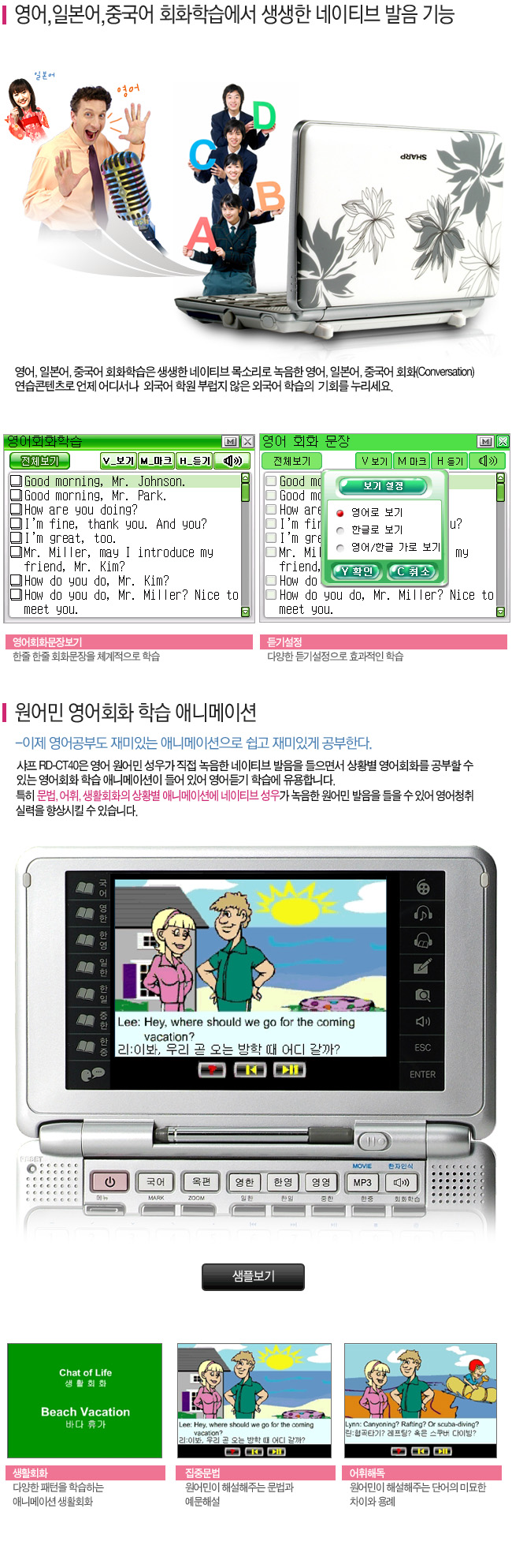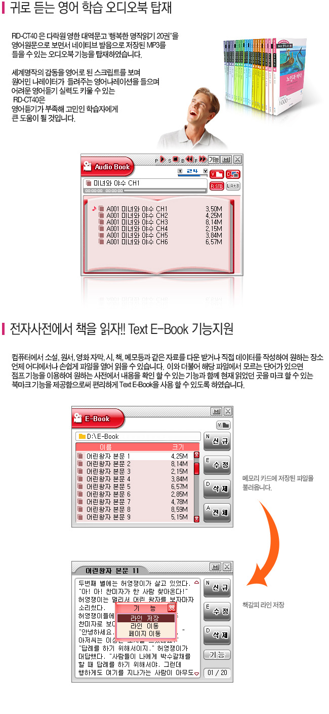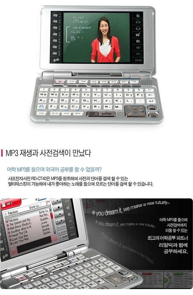 1. RD-CT40은 샤프전자에서 무료로 제공하는 동영상 강의를 이용할 수 있도록 RM(Real Media) 형식의 파일을 지원하는 기기입니다. 따라서 본 기기는 폐사의 홈페이지에서 RD-CT40용으로 제공하는 동영상 강의를 아무런 제한이 없이 다운로드하여 무료로 이용할 수 있습니다. |