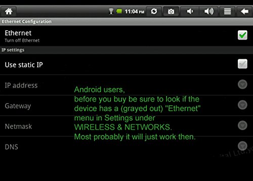 Limited Android compatibility. Android users, before you buy be sure to look if the device has a (grayed out) "Ethernet" menu in Settings under WIRELESS & NETWORKS. Most probably it will just work then
