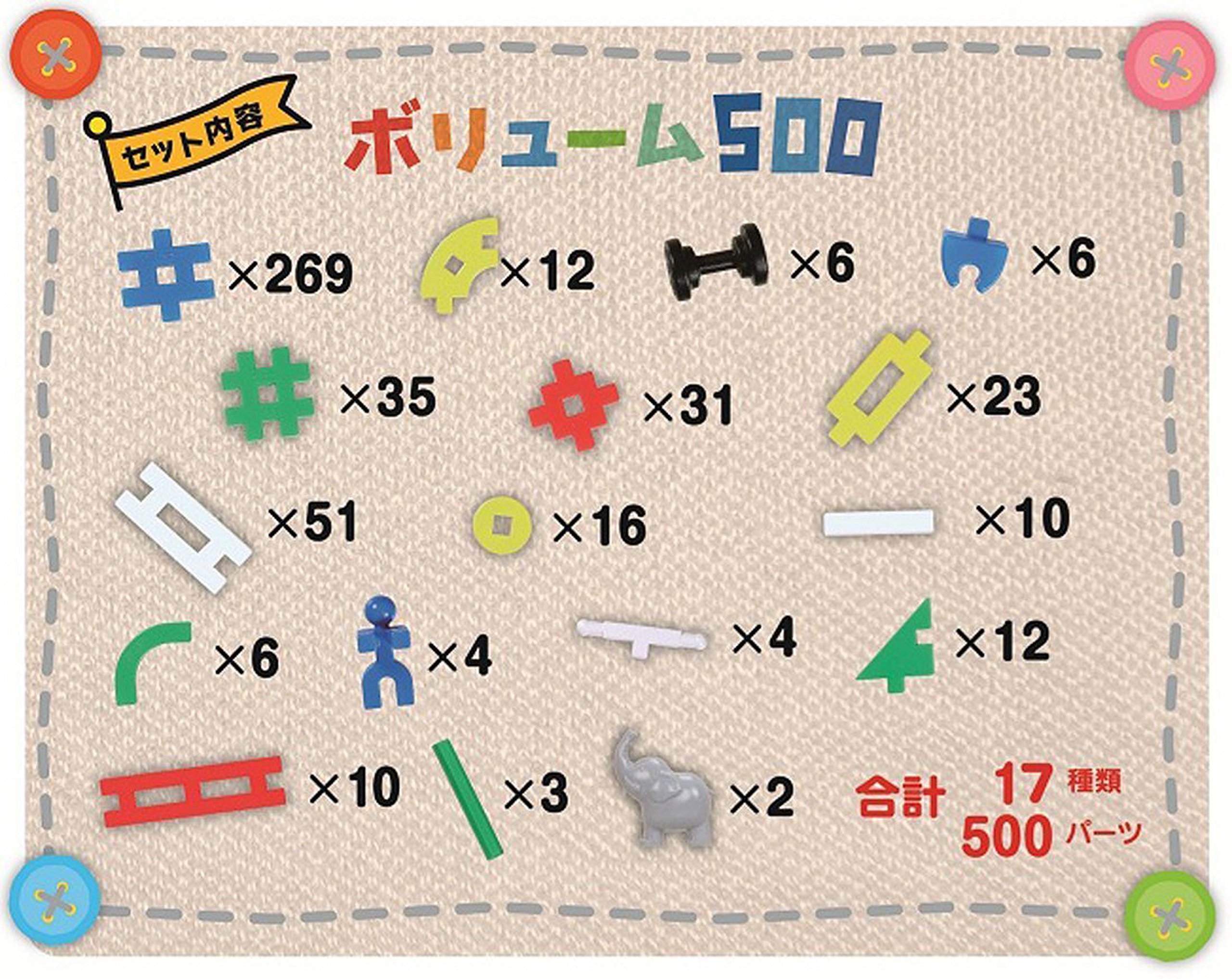 Includes: Block · 17 types of 500 parts, instruction manual
