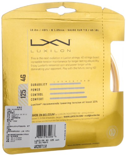 Binding : Sports Product Description This is the latest in the Luxilon co-polymer string line: the Luxilon 4G Tennis String. Durability is mastered with maximum tension maintenance, while Luxilon's legendary power and spin cater to an aggressive style of play. These elements combine to form a long lasting string that is a popular choice on pro tours. Luxilon is preferred by 73% of ATP Top 100 players.?. 0