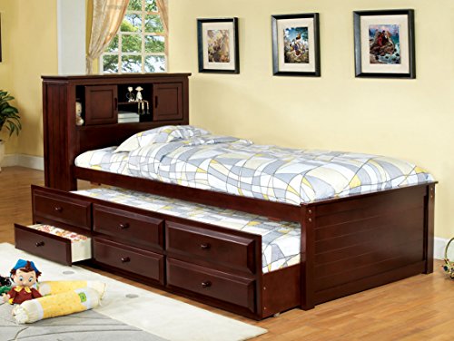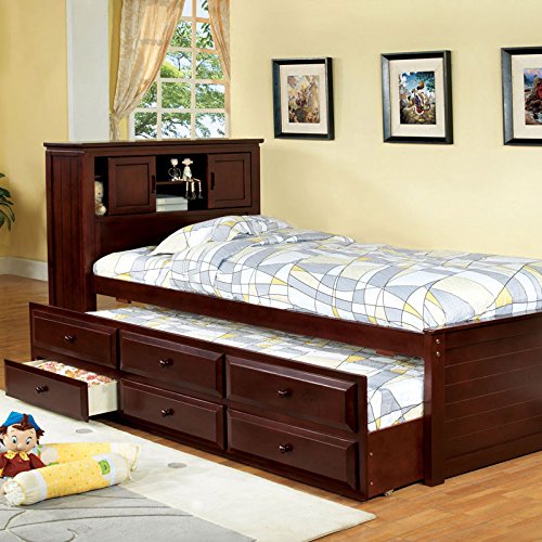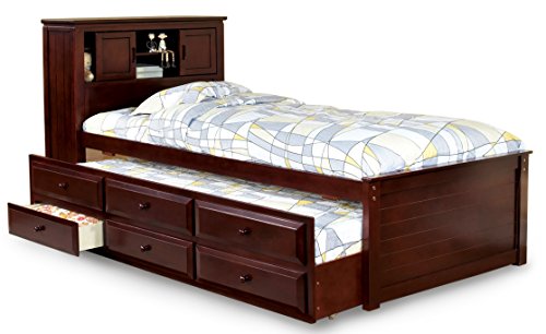 Product Description This classic twin trundle bed has a built-in bookcase headboard with sliding doors. Mattress ready, this captain bed also includes a trundle and three drawers. Finished in either a cherry finish. 0