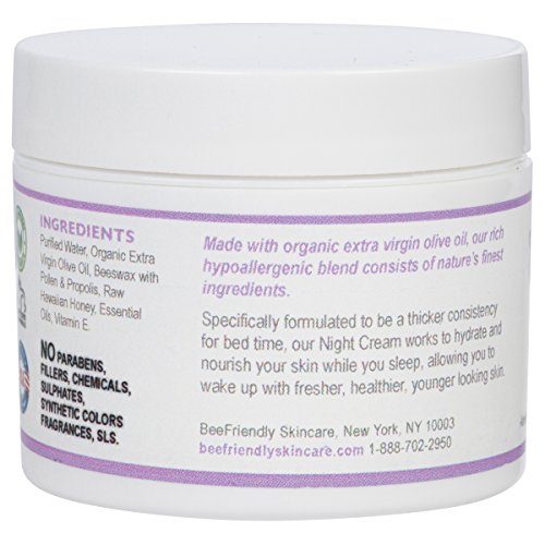 -. Binding : Misc. -. Brand : Bee Friendly Skincare -. Color : White -. EAN : 0784672123723 -. Feature : FIGHTS SIGNS OF AGING - Our All Natural Ingredients Quickly Reduce the Appearance of Fine Lines, Wrinkles, and Other Signs of Aging or Mature Skin WHILE YOU SLEEP! Look and Feel Younger Naturally! Deeply Hydrating Formula will Nourish and Feed Your Skin AS YOU SLEEP! / NATURAL AND ORGANIC - All of the Ingredients Used in This Naturally Powerful Wrinkle Cream are Ingredients you can Actually Recognize and Pronounce! No Synthetic Chemicals or Fragrances that can Damage and Irritate your Skin or Worse! Your Skin is Your Bodies Largest Organ and Everything you Apply to it IS ABSORBED into Your Bloodstream. We NEVER Test on Animals! No Parabens! No Chemicals! No Fillers! No Binders! We Only use Ingredients That are Good For Your Skin / PROTECTS YOUR SKIN - Our Wrinkle Cream Contains a Wealth of Antioxidants to Protect Your Skin Against Damage from Free Radicals and Encourages Healthy Cell Regeneration! / EASY AND CONVENIENT - Our Thickest Cream Formula Makes Applying This Potent and Concentrated Night Time Wrinkle Cream Easy. Just Apply it Before You Go to Bed and Wake Up to Fresher, Younger-looking Skin! / MADE IN THE USA - Our Wrinkle Cream is Handmade by Beekeepers in Hawaii! The Natural Ingredients and Techniques Have Been Used for Centuries! Limited Supply 2 oz Size - We sell out frequently, get it while it's in stock! -. Label : Bee Friendly Skincare -. Manufacturer : Bee Friendly Skincare -. MPN : 0784672123723 -. NumberOfItems : 1 -. PackageQuantity : 1 -. PartNumber : 0784672123723 -. ProductGroup : Beauty -. ProductTypeName : BEAUTY -. Publisher : Bee Friendly Skincare -. Size : 2 oz -. Studio : Bee Friendly Skincare -. Title : Best Night Cream - 100% All Natural & 80% Organic Night Cream By BeeFriendly, Anti Wrinkle, Anti Aging, Deep Hydrating & Moisturizing Night Time Eye, Face, Neck & Decollete Cream for Men and Women -. UPC : 784672123723