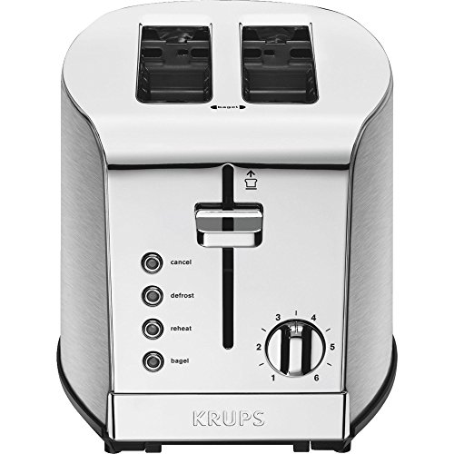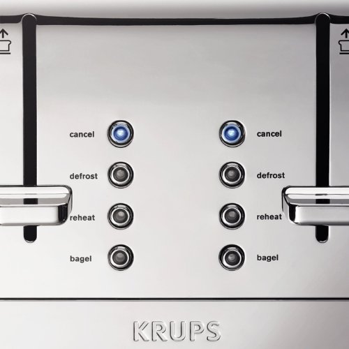 Housed in brushed and chrome stainless steel, this high-quality KRUPS KH734D50 toaster not only looks good on the counter, but it also toasts bread to perfection—up to four slices at a time. The unit's extra-large, self-centering slots (1.5 inches wide by 5.75 inches long) can accommodate a variety of items, including bagels, buns, English muffins, and thick slices of homemade bread. For added convenience, dual independent controls make it possible to use only one side or the other, or to toast two unique orders simultaneously, like bread on one side and waffles on the other, making it easier to get the whole family out the door on time in the morning. Choose bagel mode for warming the outside and toasting the cut side of bagels; defrost mode for toasting items like frozen waffles, toaster pastries, or toaster hash browns; reheat mode for warming without toasting; or the cancel function to end the session at any time. You just have to turn the knob to select one of the six browning settings, from light to dark. Other highlights include blue LED indicators, a high-lift lever for smaller items, two removable crumb trays for easy cleaning, and cord storage to help keep countertops looking tidy. The KRUPS KH734D50 four-slice toaster offers exceptional convenience on its own or as part of the matching KRUPS Breakfast Set ensemble. wattage is 1500Feature